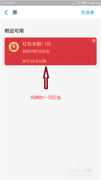 在付出宝劵洁界面中可以看到我们适才兑换的一元红包,到店付出时就可以利用这个红包了。