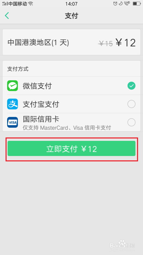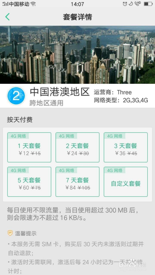 点击“中国港澳地域”,按照本身的观光时候选择适合本身的套餐。好比点击一天的套餐,就进入付出页。