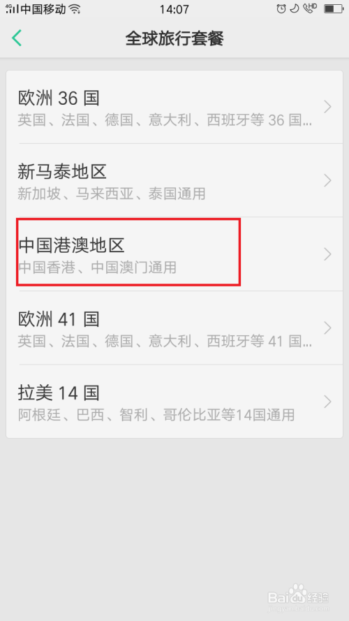 点击“全球观光套餐”,进入新页面,找到“中国港澳地域”。