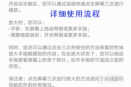 下图是该功能的具体利用方式,其实利用起来也很简单,我们只需在需要放年夜的肆意界面,快速持续的三次点击屏幕即可,想要返回到之前的状况只需再次三击屏幕就可以了;
