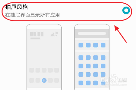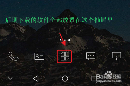 我们只需将系统默认的气概更改为“抽屉气概”即可,然后只要不是系统自带的应用,在我们每次下载今后就不会显示到桌面了,而是放置在图二所示的“抽屉”里,点击此图标可以查看;