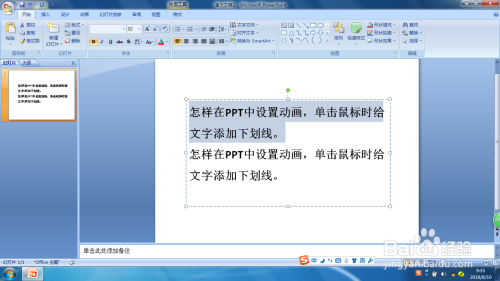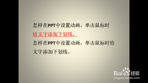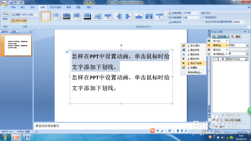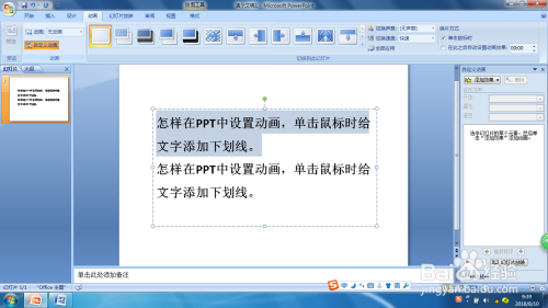 在PPT演示时为了强调某部门文字,可以给这部门文字添加自界说动画,单击鼠标时在文字下面呈现下划线。下面请分享在PPT2007中设置添加下划线动画。
