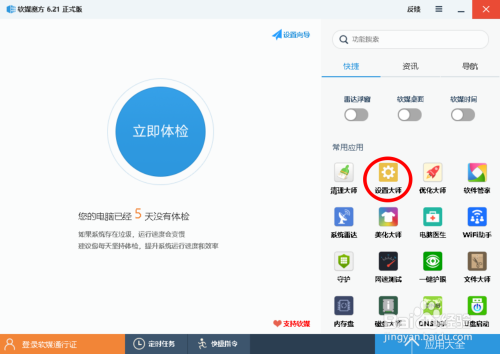 启动软媒魔方法式,点击:设置巨匠,打开软媒设置巨匠窗口;