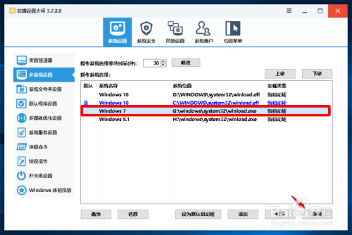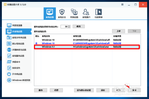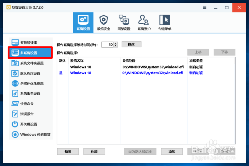 在 软媒设置巨匠 窗口中,我们先点击窗口左侧的【多系统设置】,在对应的右侧窗口中,我们可以看到: