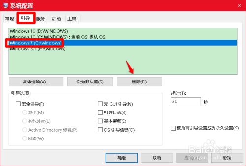 在系统设置装备摆设窗口中,我们点击【指导】,在指导标签下,点击不需要的开机启动项,如 Windows 7,再点击:删除;