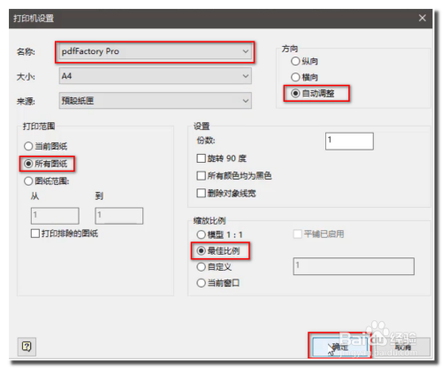选择打印机为PdfFactory(虚拟打印机),PdfFactory打印机安装方式不做介绍。其他按照图设置。