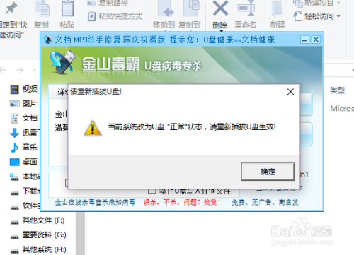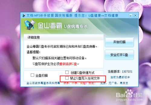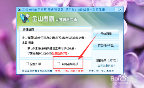 除了利用简单的文件权限办理中设置以外,我们还可以利用其他第三方软件来设置U盘的读写权限,例如:金山U盘病毒专杀软件,点击软件界面中的“高级设置选项”设置。