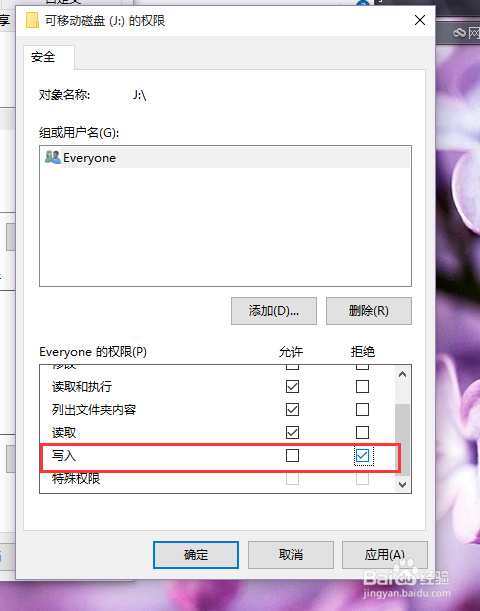 当然,日常平凡我们还需要对U盘设置可读权限,因为究竟结果要拜候U盘数据的,那么该怎么操作呢?其实很简单,我们只需要在权限办理页面中,将“写入”权限设置为拒绝即可。