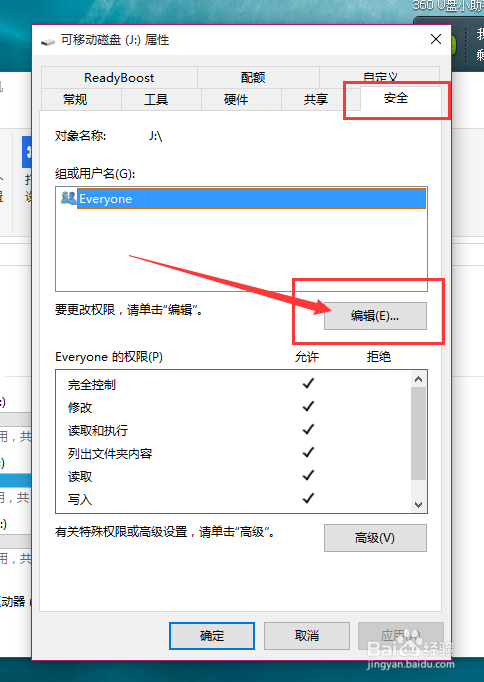 进入USB设备的属性页面之后,点击“平安”选项卡,然后起头设置USB设备的平安选项,点击如上图所示的“编纂”按钮。