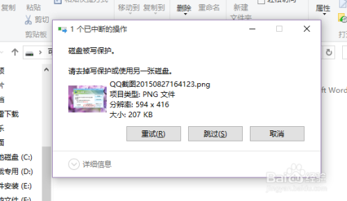 接下来,我们仍是测验考试在U盘中写入一个文件,页面会提醒“U盘被写庇护”,无法复制进入一个文件。
