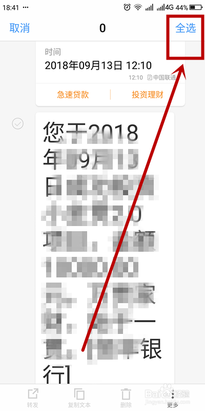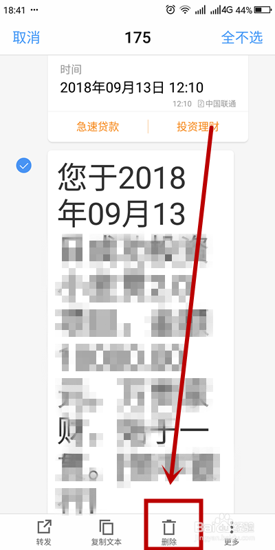 在这一类信息页面,我们找到要删除的发信人。这里选择某银行客服短信来做例子。单击该银行客服