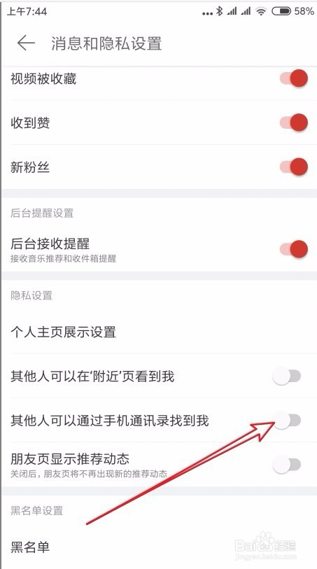 我们把厥后面的开关设置为封闭状况。如许今后我们就不会呈现在手机通信录的保举名单中了。