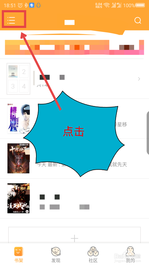 在小书亭书架界面,点击左上角的三横。如图所示