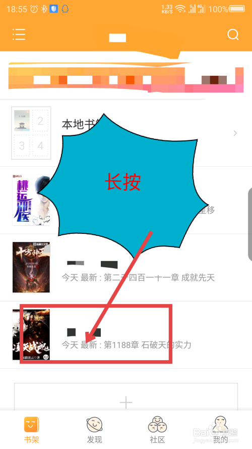 设置完当作后,返回书架,选择小说长按屏幕。如图所示