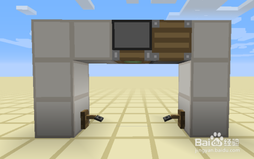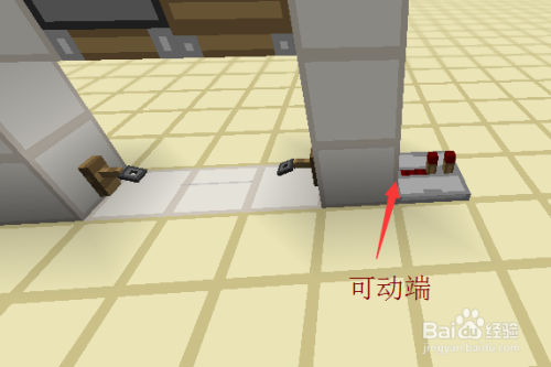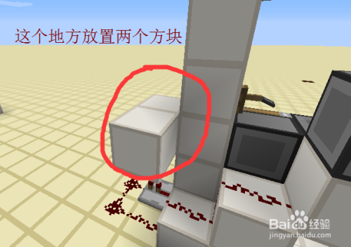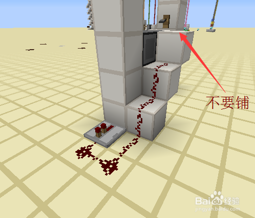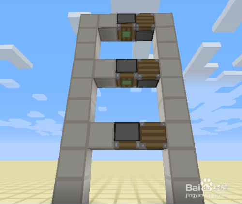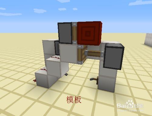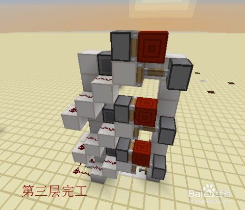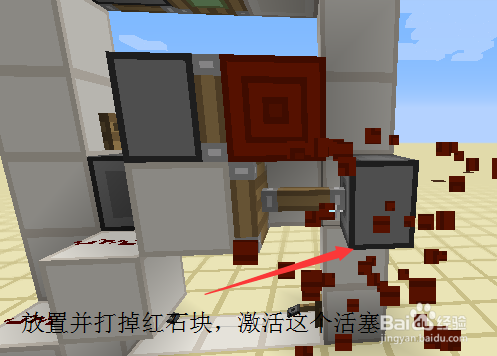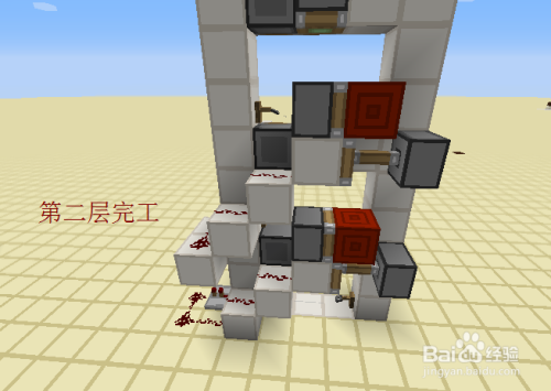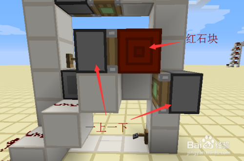 接下来就是每一层的最后工序的,我们绕到后面,交织放置两个相对的粘性活塞,上面的一个黏上红石块,下面的一个在旁边放一个红石块激活后,当即把红石块打失落。具体如图所示。