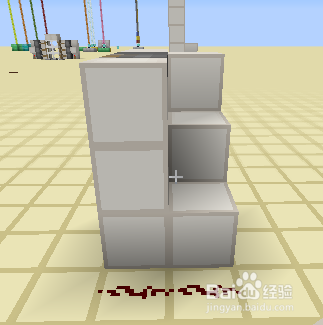 然后就是在第二层右侧绊线钩方块后背下方铺两个方块,以便我们铺设红石线。再叠好阶梯列,放好两个粘性活塞和红石块,最后连上红石线即可。