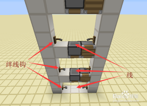 在每一层的第一格两侧各放置一个绊线钩,然后在之间放上线。
