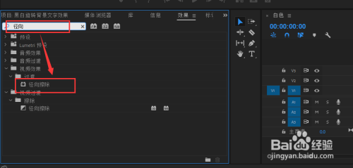 打开结果窗口,在结果窗口的搜刮栏中输入关头字“径标的目的”,在搜刮呈现的成果中选择“径标的目的擦除”结果,选中该结果将其拖到视频轨道2的黑色的颜色遮罩上,为黑色的颜色遮罩应用该结果。