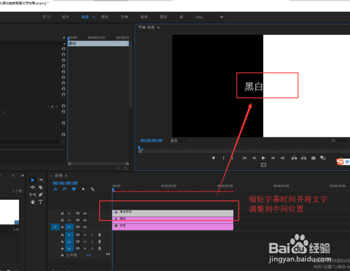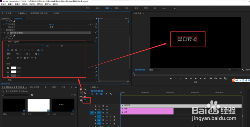 选择文字东西,在节目窗口中输入文本内容“口角转场”,在结果控件中设置文字的颜色要为白色,其他字体,字号等属性随意设置即可;然后将视频轨道3的文本显示时候与轨道1和2对齐,并用移动东西调整文本的位置使其处于中心位置。