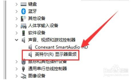 在设备办理器中找到声音、视频和游戏节制器,然后点击两次因特尔显示器音频