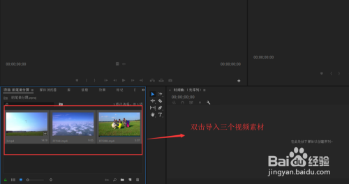 进入到PR操作界面后,找到项目窗口,在项目办理窗口的空白处双击鼠标,弹出媒体导入窗口,选择三个分歧的视频媒体,进行导入到PR中。