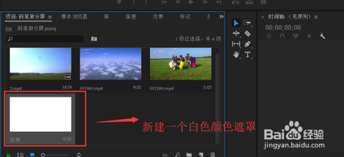 选中新建的白色的颜色遮罩,将其拖入到时候轴窗口中单击建立一个剪辑序列,此时白色遮罩处于时候轴的视频轨道1上;然后在将别的三个视频媒体别离放在视频轨道2到视频轨道4上。