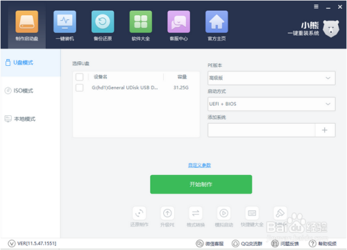 经由过程下载好的小熊一键重装系同一键建造U盘启动盘。