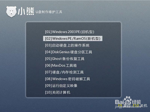 之后窗口里面会有几个选择,我们要找到并按上下偏向键"↑↓"选择到u盘,然后按回车键进入小熊一键重装系统PE本家儿界面。在小熊一键重装系统的本家儿菜单界面中经由过程偏向键选择“02.启动WindowsPE/RamOS(新机型)或者“01. Windows2003PE(旧机型) ”两个版本的PE系统都可以选,用户可以按照本身的电脑设置装备摆设而定,选中后按下回车键,就可进入PE系统,然后就可以按以下步调安装系统。