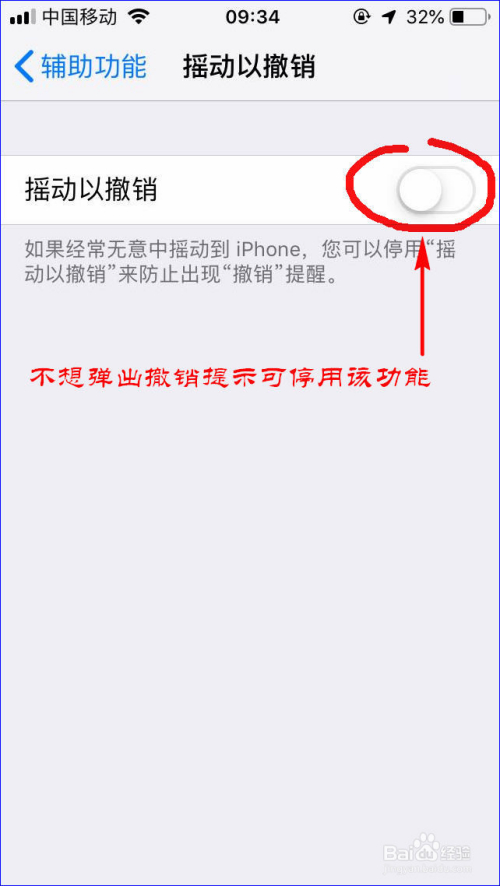 当然,若是我们老是经常不小心摇脱手机,不想iPhone又总弹出撤销键入的提醒,那我们就可以按之前的步调在设置里封闭摇动以撤销功能就行了。