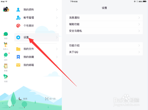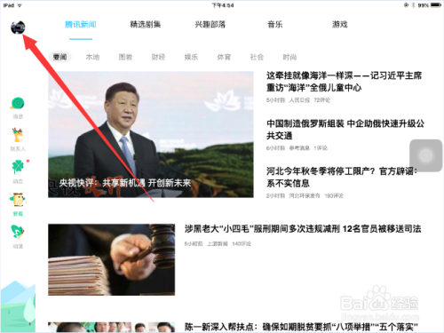 在苹果平板电脑上打开QQ软件,点击位于页面左上角的QQ头像。