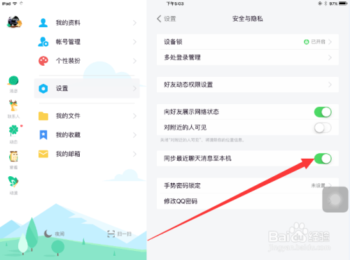 将“同步比来聊天动静至本机”的开关打开,苹果手机上的QQ动静就能在苹果平板电脑上看到了。