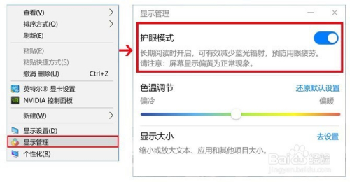 那么要如何开启护眼模式呢?很是简单,鼠标右键点击电脑桌面空白处,在弹出选项卡中选择“显示办理”,点击开启“护眼模式”。如下图所示: