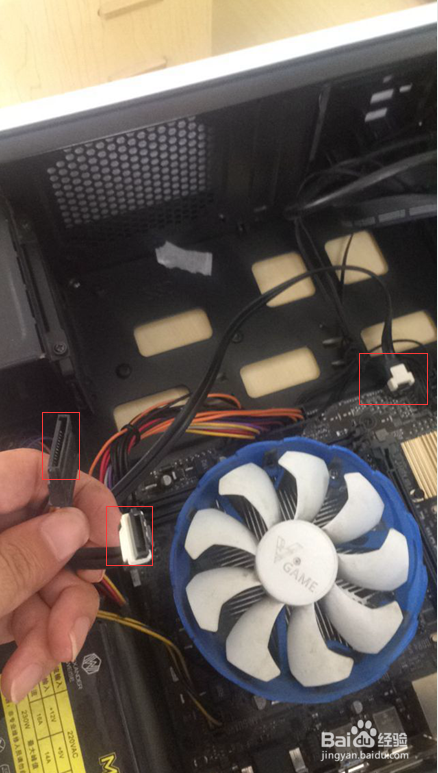 找到匹配硬盘的电源线和插在本家儿板上的毗连线,如图