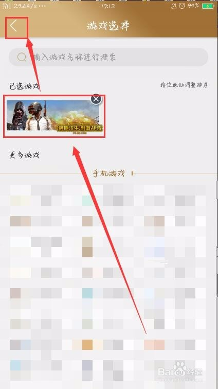 点击刺激战场按钮,查看是否已经在已选游戏栏中存在了,存在的话,就点击返回按钮。如图所示。
