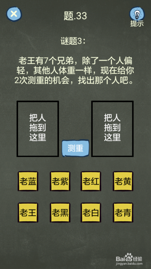 第33关给他们称重,称两次重量后,选择轻得阿谁人,然后就过关了。