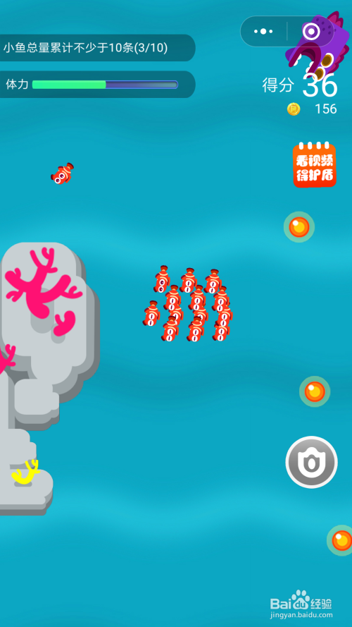 碰到暗礁石时,也需要扭转偏向,遁藏暗礁,去寻找食物和小鱼,只要触碰着孤独的小鱼和食物则就会增添金币得分。