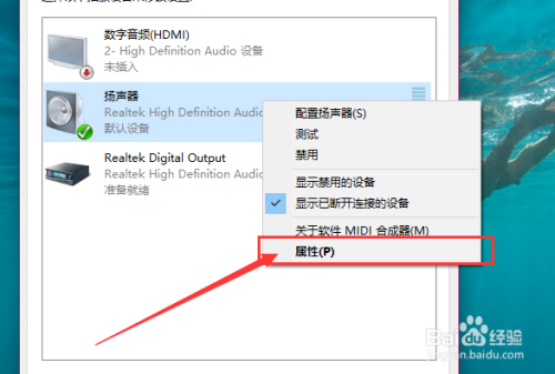 若是按照上面的步调还没有解决问题的话,我们是需要看看声音播放设备的默认设置属性的。对着扬声器图标击右键,点击选择“属性”选项。