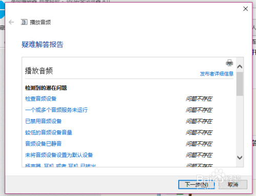 接下来,将会主动打开疑难解答界面,Windows会主动检测声音问题,以及给出响应的解答建议。