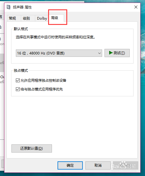 在声音属性界面中,我们点击“高级”菜单选项,然后点击页面中“还原默认值”按钮。