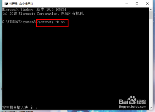 接下来,请大师在提醒符页面中输入“powercfg -h on"号令,该号令其实是开启系统的休眠功能,因为若是系统休眠功能掉效的话是不克不及实现快速启动的。