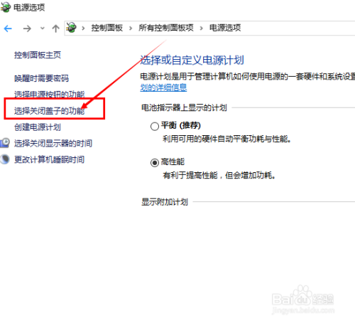 进入电源选项号令之后,我们需要点击页面左侧的功能菜单选项,点击选择“封闭盖子的功能”选项,点击进入该选项之后我们即可起头设置页面。