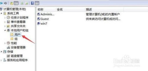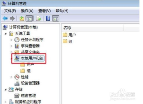 然后在电脑办理中找到当地用户和组,点击进入办理