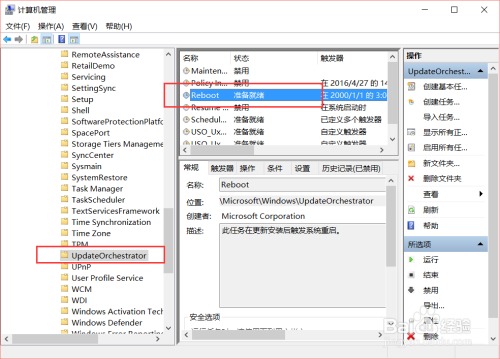 接下来,在打开的Windows子目次中,我们可以看到“UpdateOrchestrator”项,选中该项之后,我们还需要选择“Reboot”菜单。
