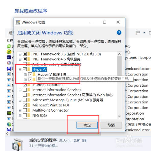 接下来,我们在功能列表中选中“Hyper-V虚拟机”功能,将所有的复选框全数勾选,然后点击页面底端的“确定”按钮。