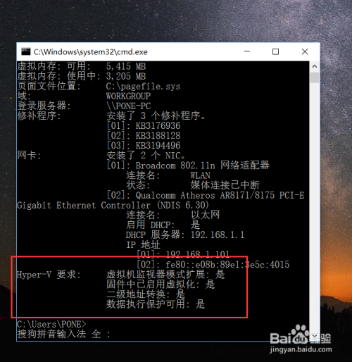 接下来,在页面中显示的信息末从头至尾,我们可以看到近似的信息,只有有关Hyper-V虚拟机的信息全数为“是”,才可以证实电脑可以运行虚拟机软件。