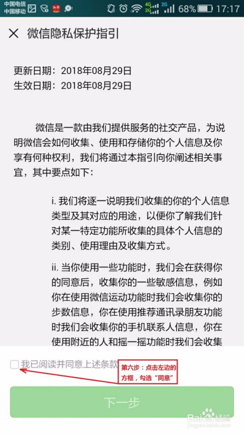 第六步:这时就到签定和谈的界面了,在这个界面要点击左下方的阿谁方框,打一个“勾”。暗示赞成条条目。