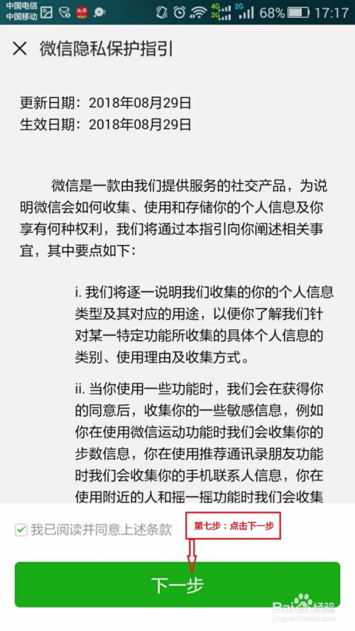 第七步:当赞成条条目后,“下一步”这个条,颜色会变的很是清楚,点一下“下一步”。