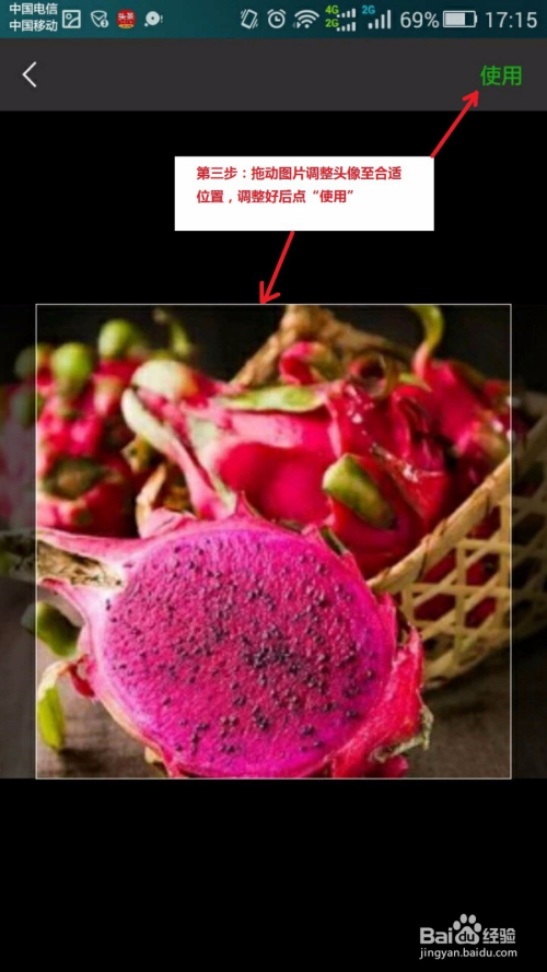 第三步:选定后会跳出这个界面,在这个界面里面拖动图片,调整图片位置,直到框取的头像抱负。再点击右上角的“利用”,就完当作了头像的设置。