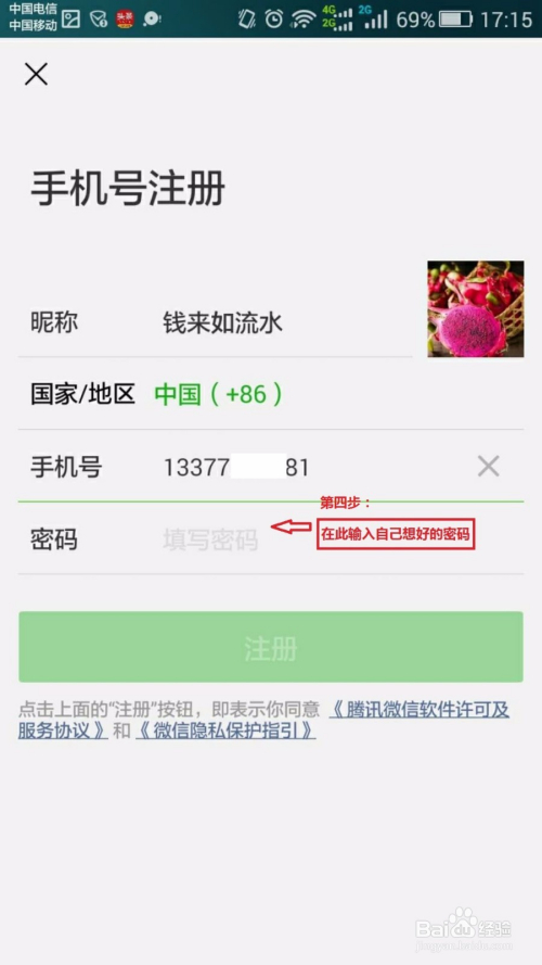 第五步:密码输入后,“注册”条的颜色会变清楚,点击它,进入下一步。