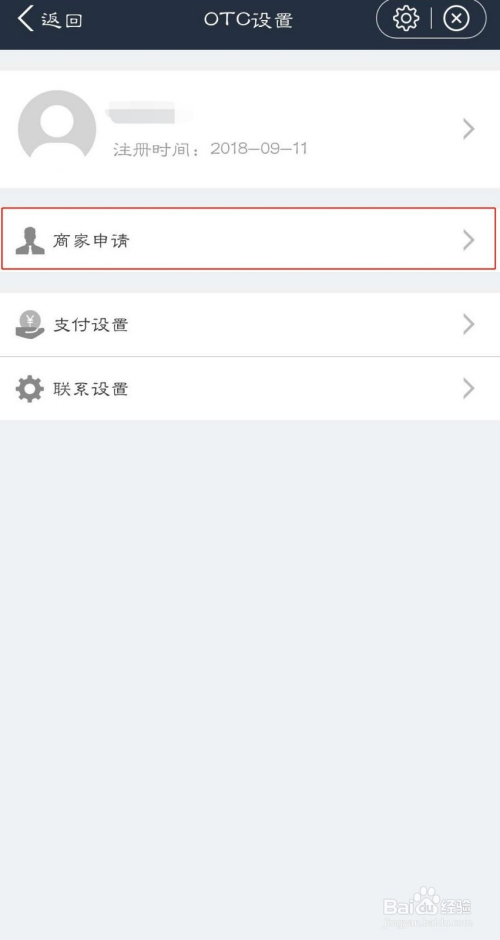 进入OTC设置界面后,点击“商家申请”,进行商家申请操作